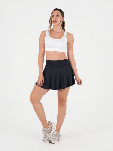 Diseño con falda simétrica y fajón de tiro medio que realza la figura con un estilo moderno, femenino y favorecedor. Incluye short interno para mayor seguridad y comodidad.